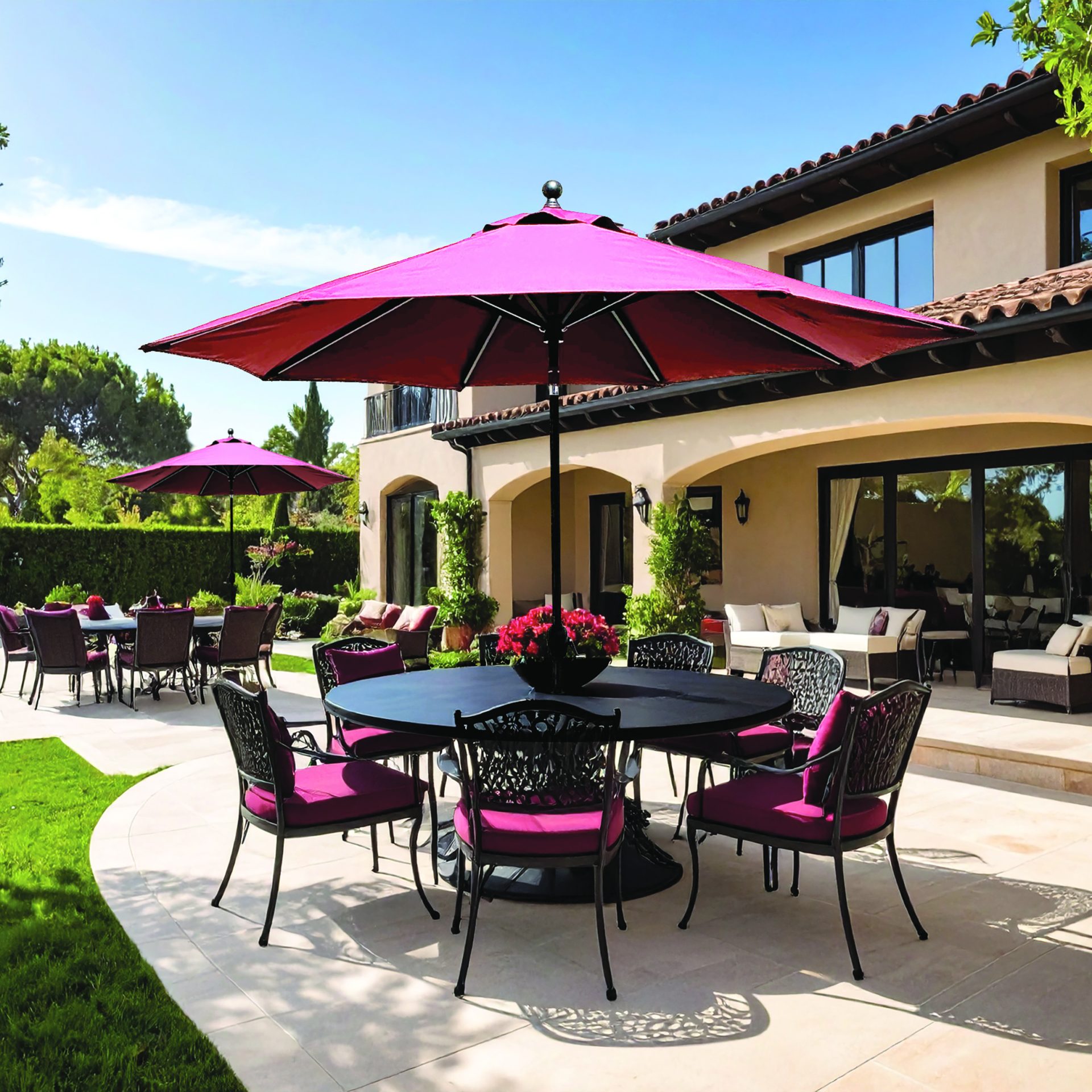 Ideal for tables up to 54 inches, the 9-foot round canopy provides generous coverage while maintaining a clean, classic profile suitable for both traditional and modern outdoor spaces.