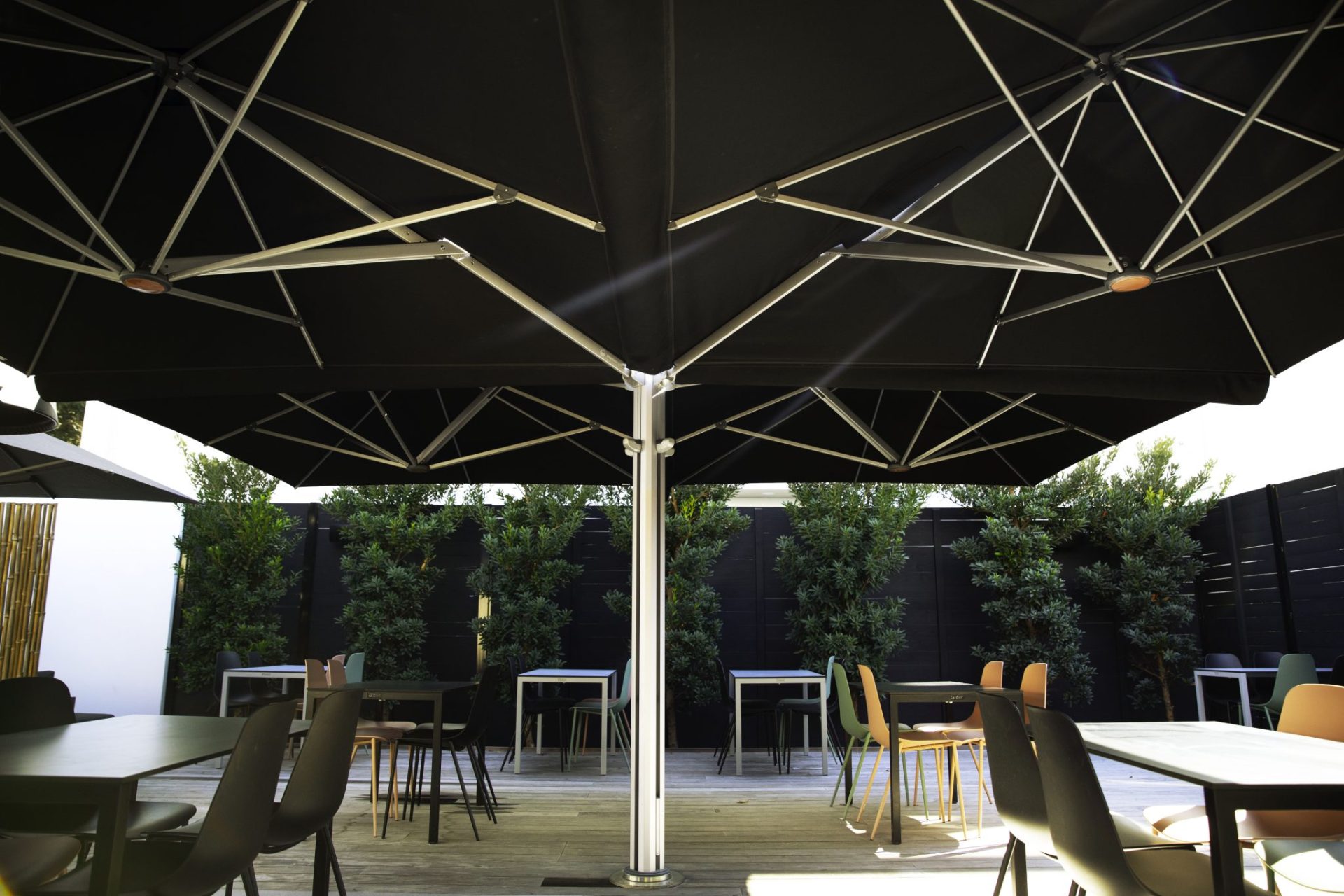Additionally, ShadowSpec designed the best commercial cantilever umbrella with flexibility in mind. The modular, multi-canopy structure accommodates various layouts and expands as your needs grow. You can operate each canopy independently, giving you the freedom to customize your shade coverage to suit any outdoor space.